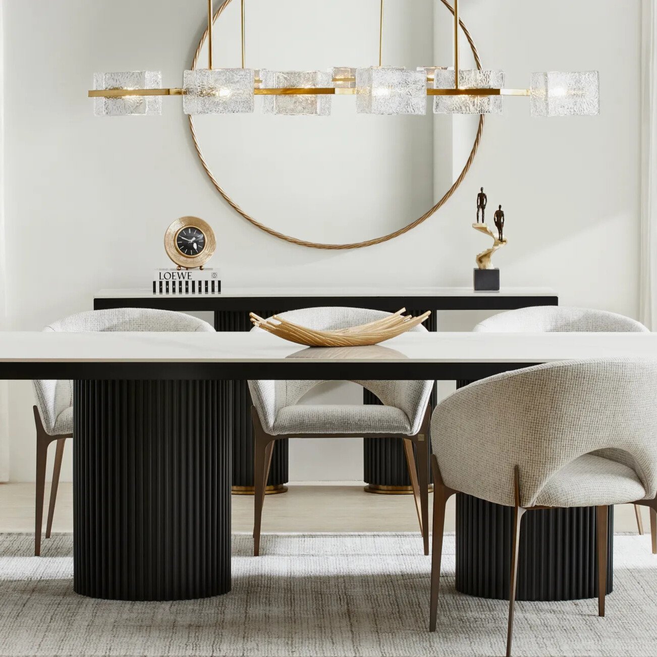 The Archie White Sintered Stone Console Table marries durability with high design, featuring a resilient white sintered stone top. This pristine surface is supported by stark black powder-coated iron column legs, grounded with elegant steel rings in a rich golden finish at the base, providing a contrasting note of opulence. It’s a piece that not only stands up to daily use but also stands out as a sleek accent in any space.