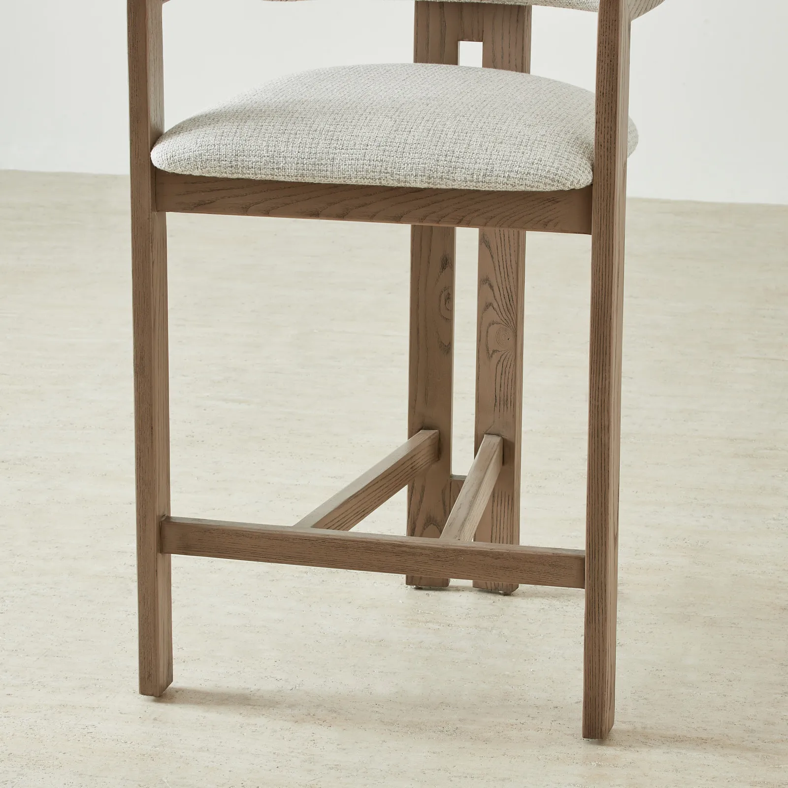 Clean lines and quiet comfort define the Desmond Counter Stool. Upholstered in dove grey fabric, its seat and backrest offer a soft, supportive place to sit.