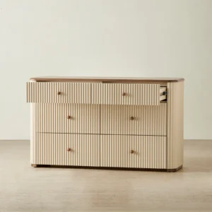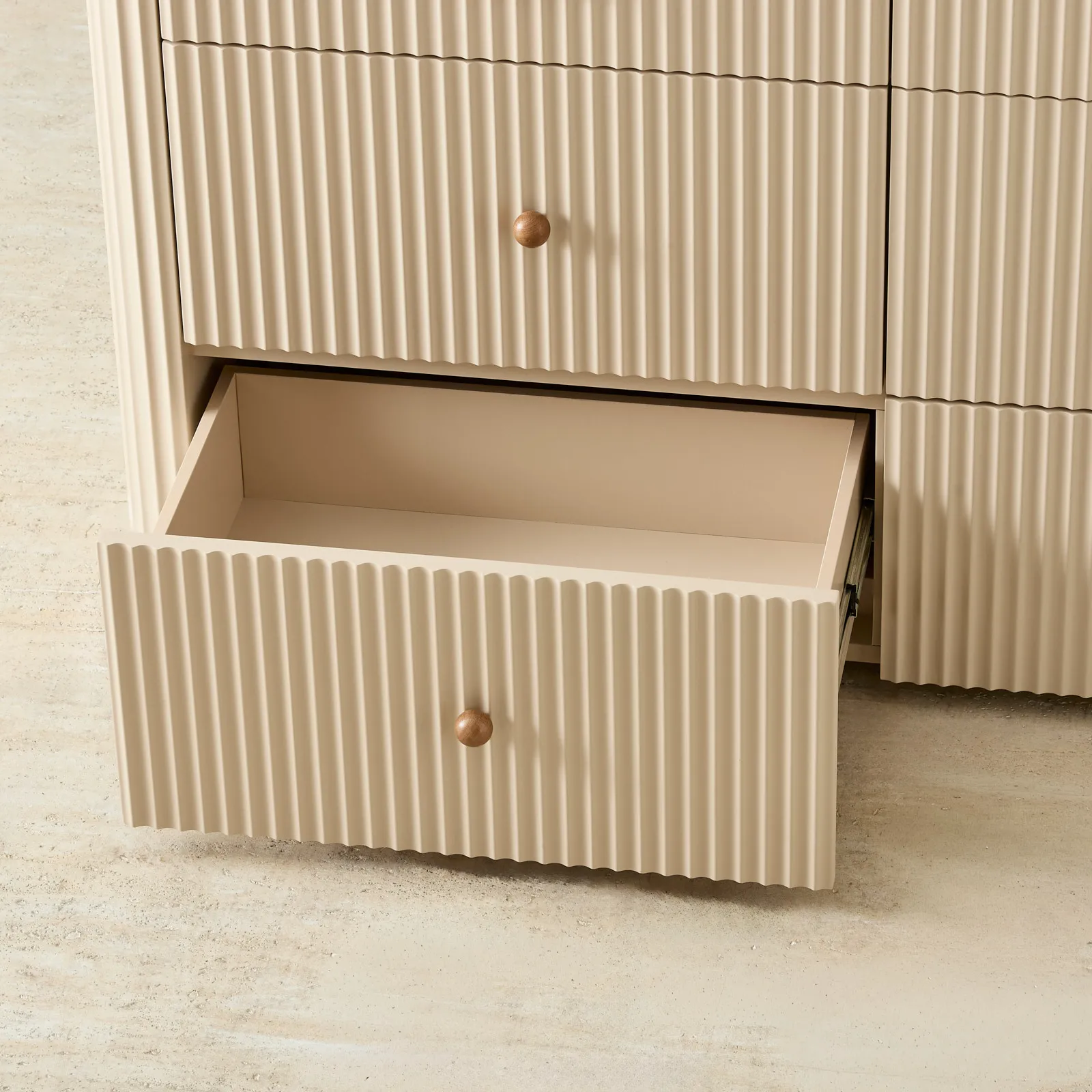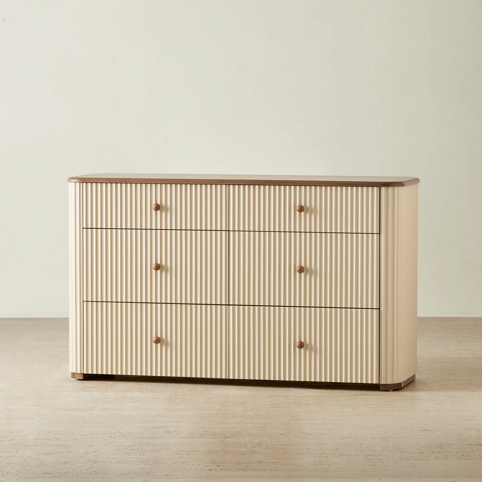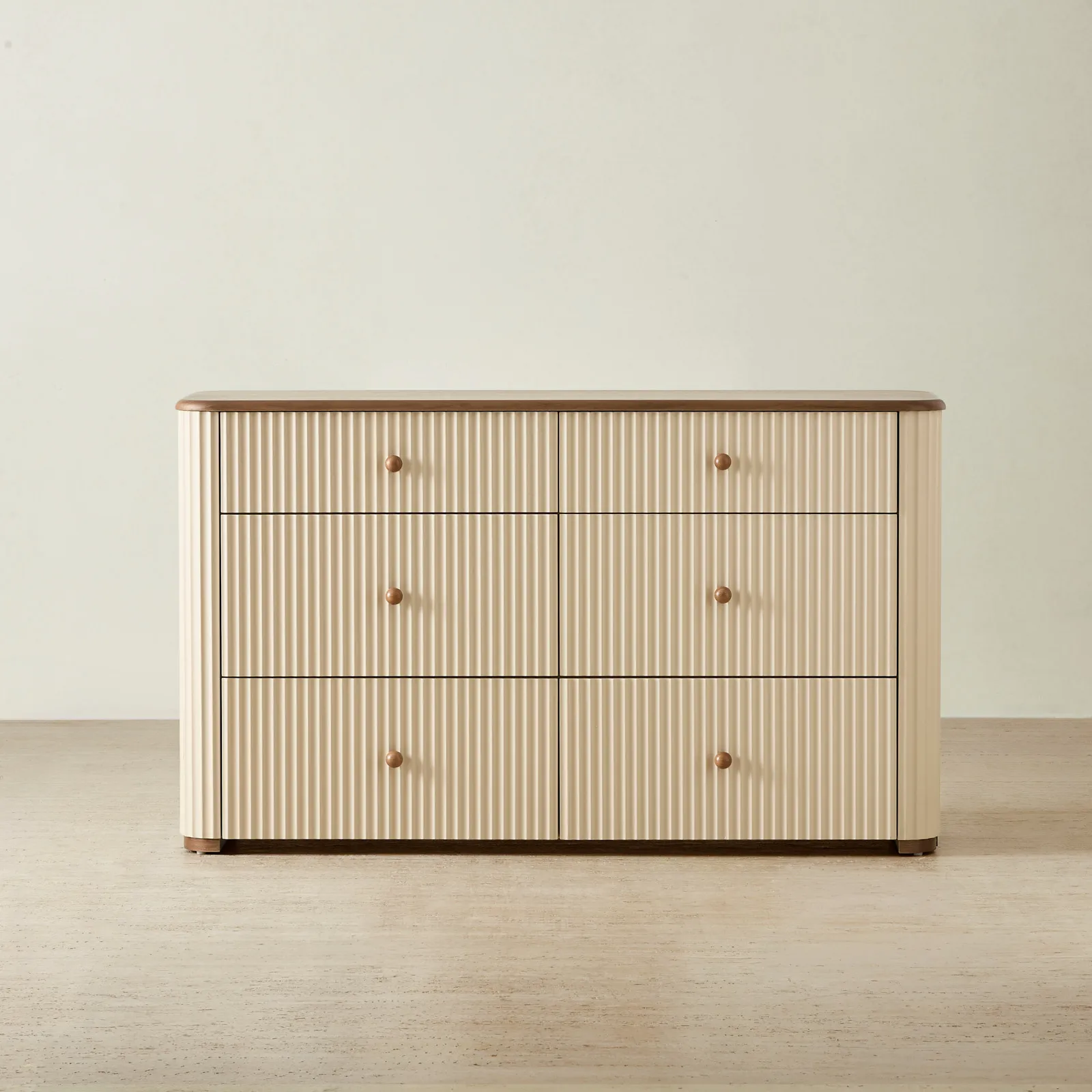 With six roomy drawers, there’s space for clothes, toys, and treasures alike. Rounded edges and ribbed sides bring a playful texture.