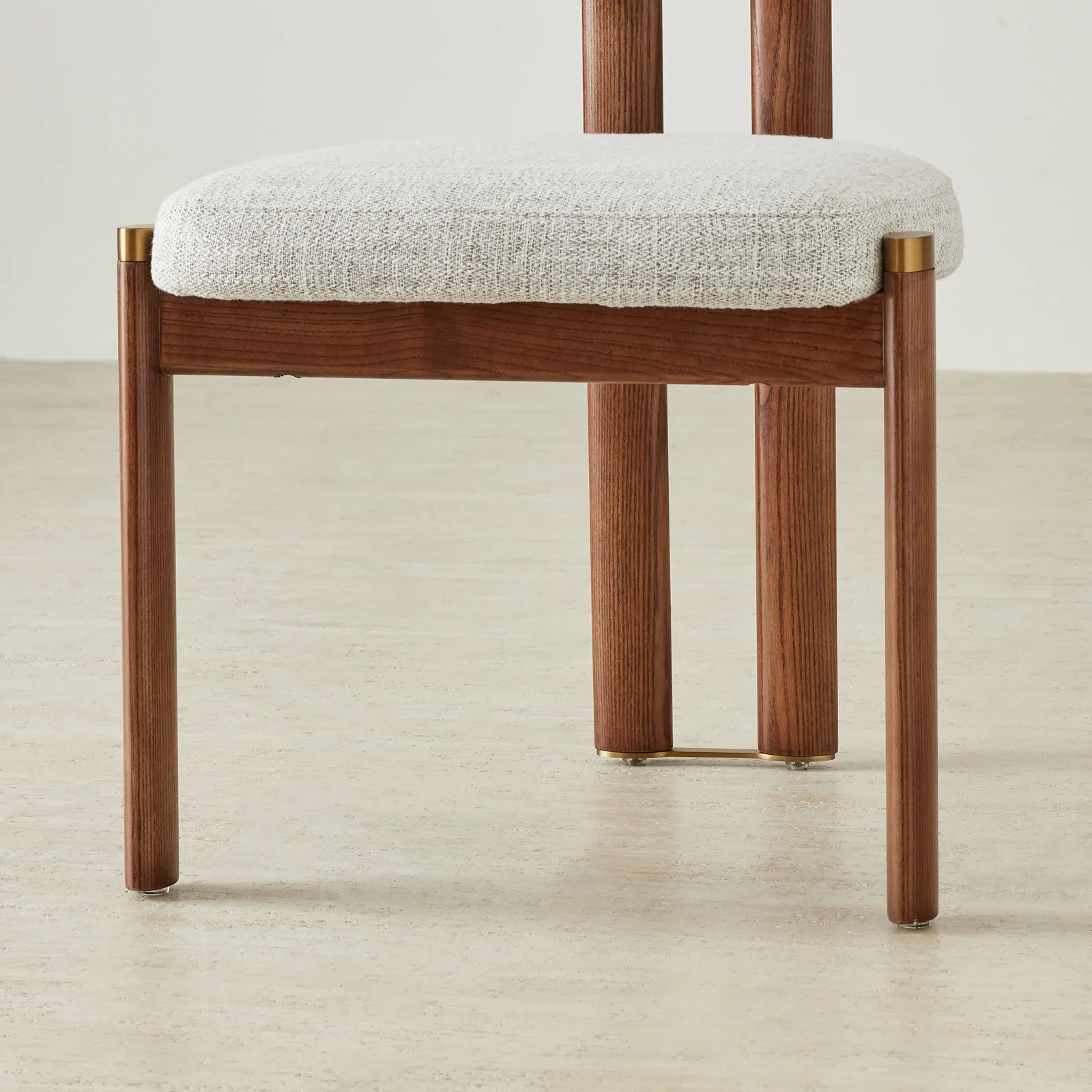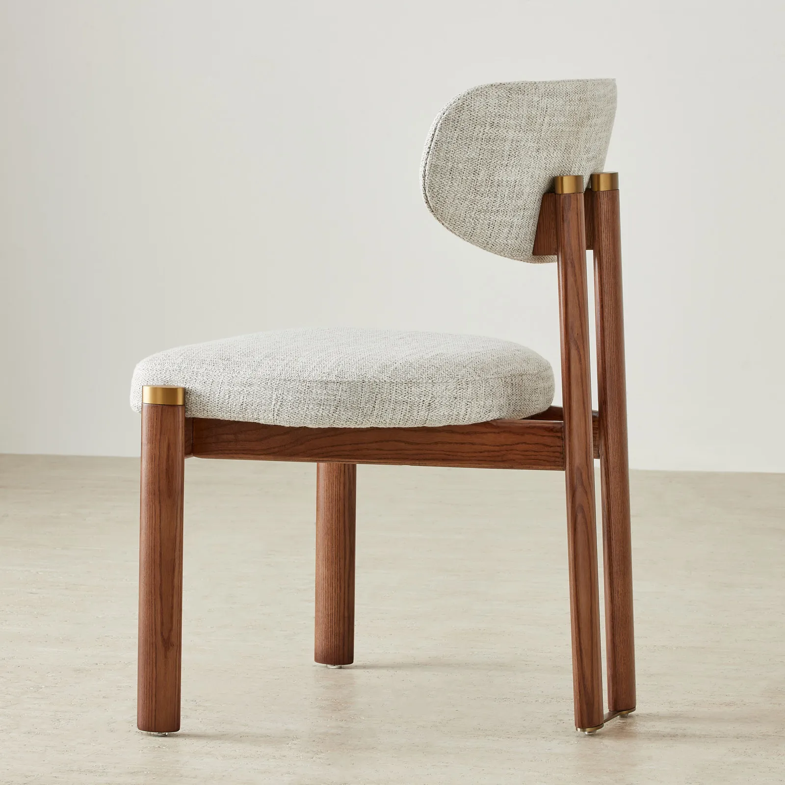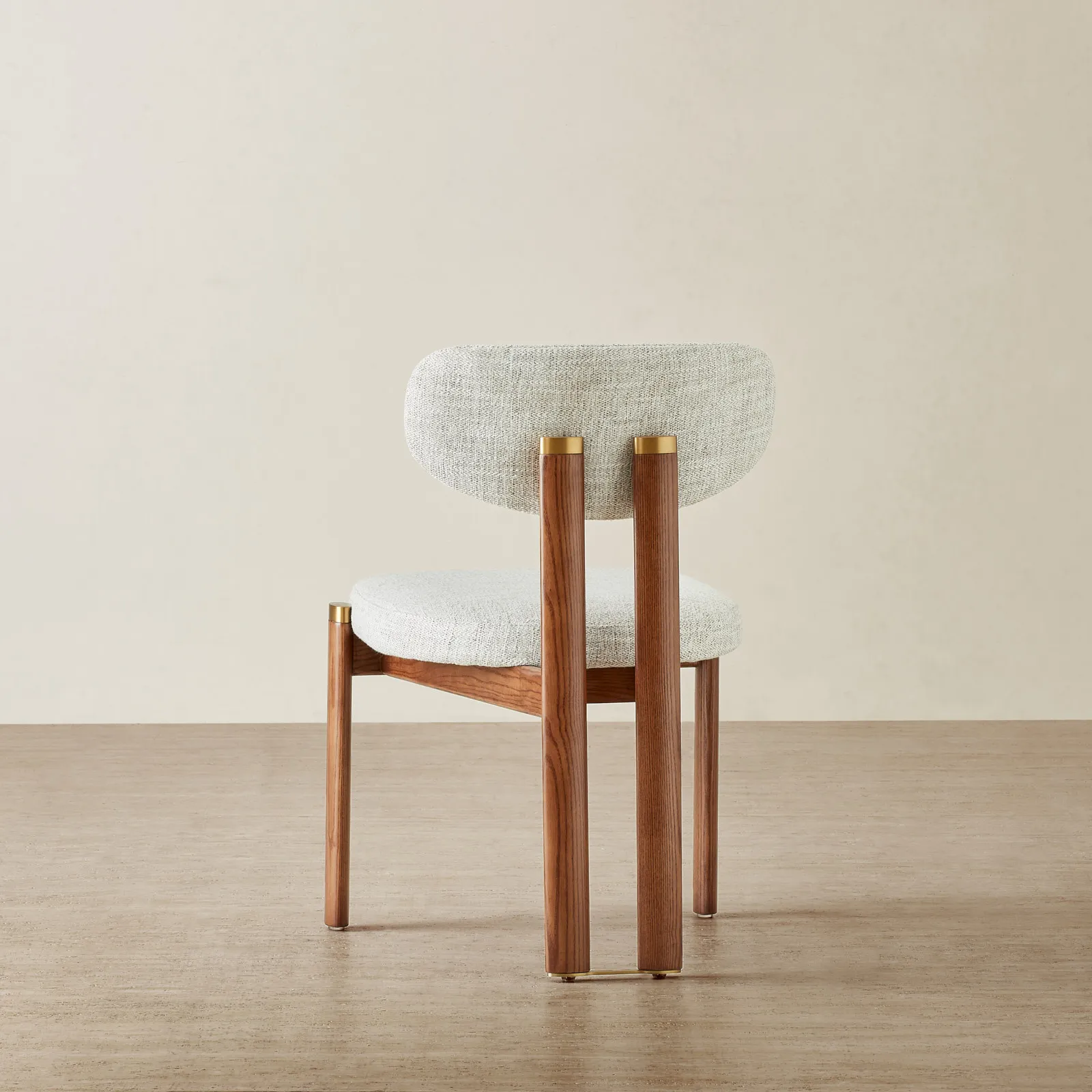 The toffee brown ash legs bring warmth and balance to the look, finished with understated brass caps. Built for both comfort and style, it fits seamlessly into modern dining spaces.