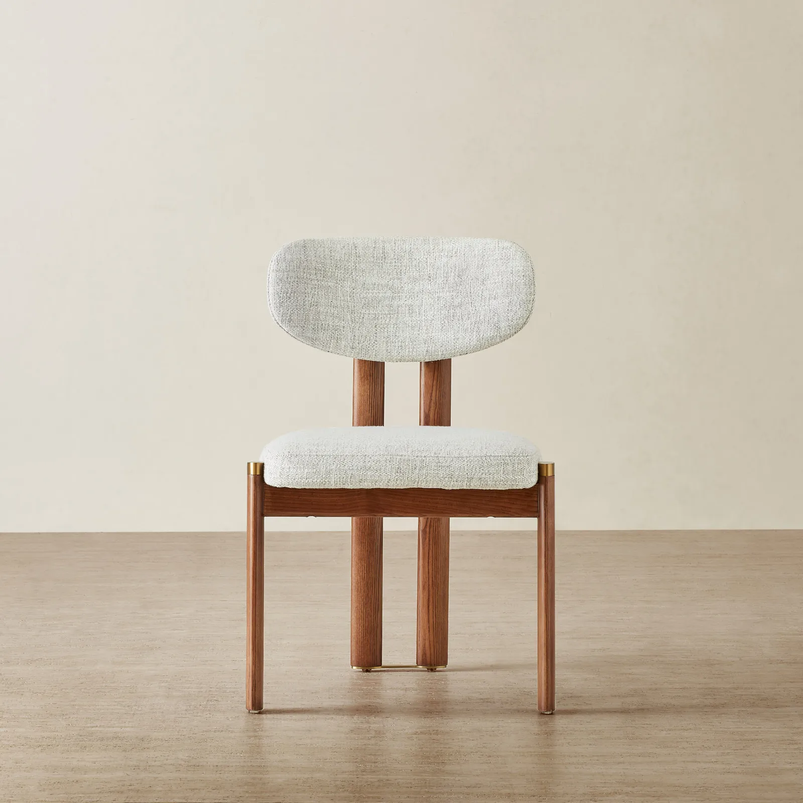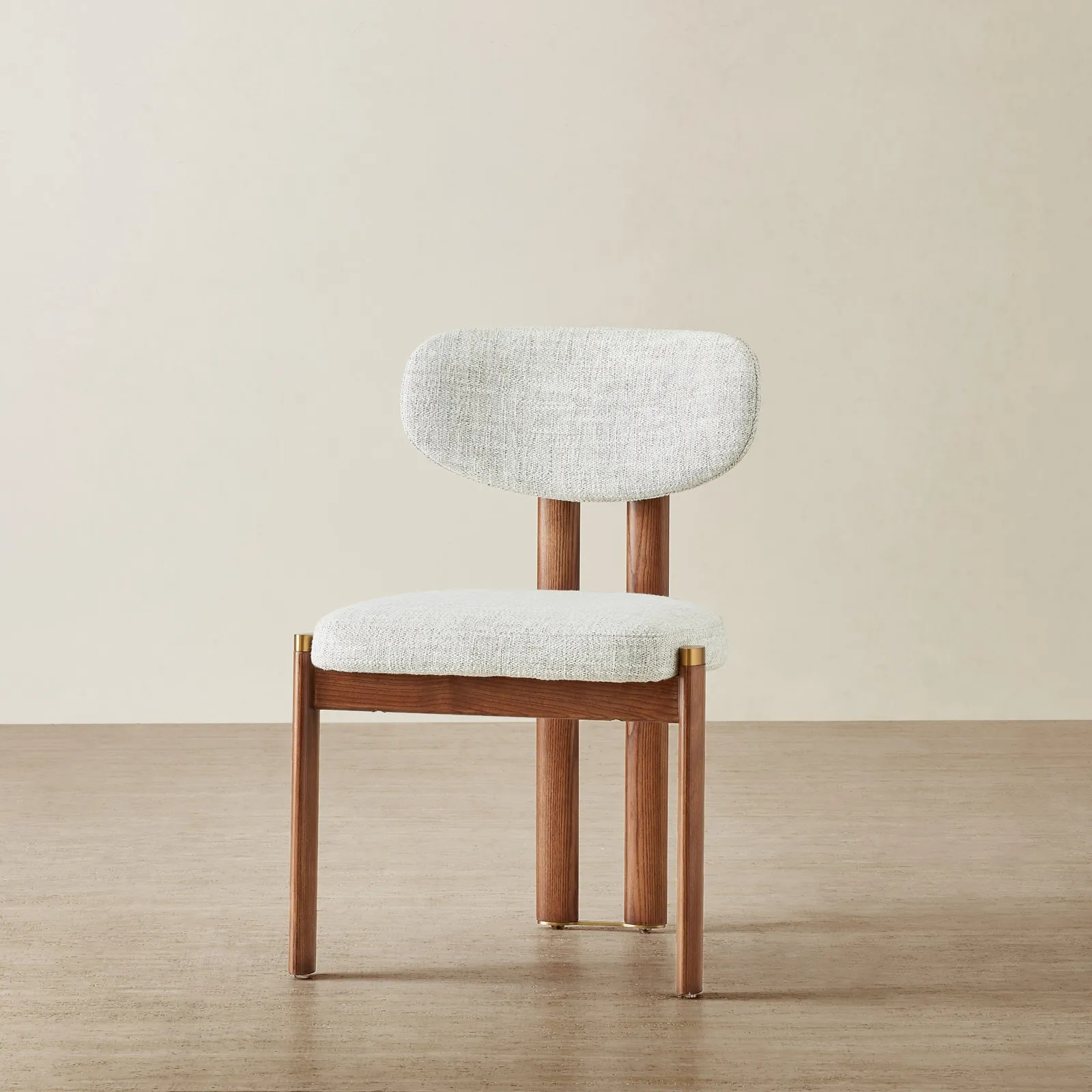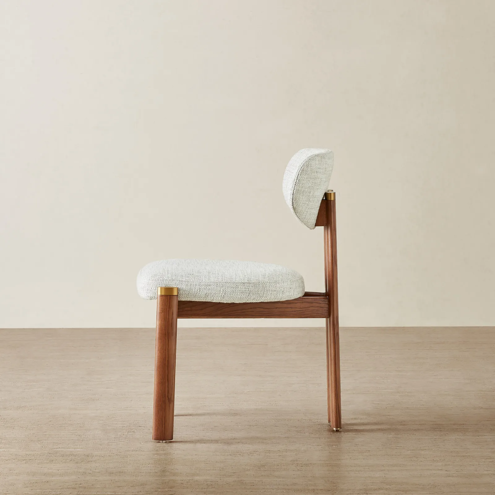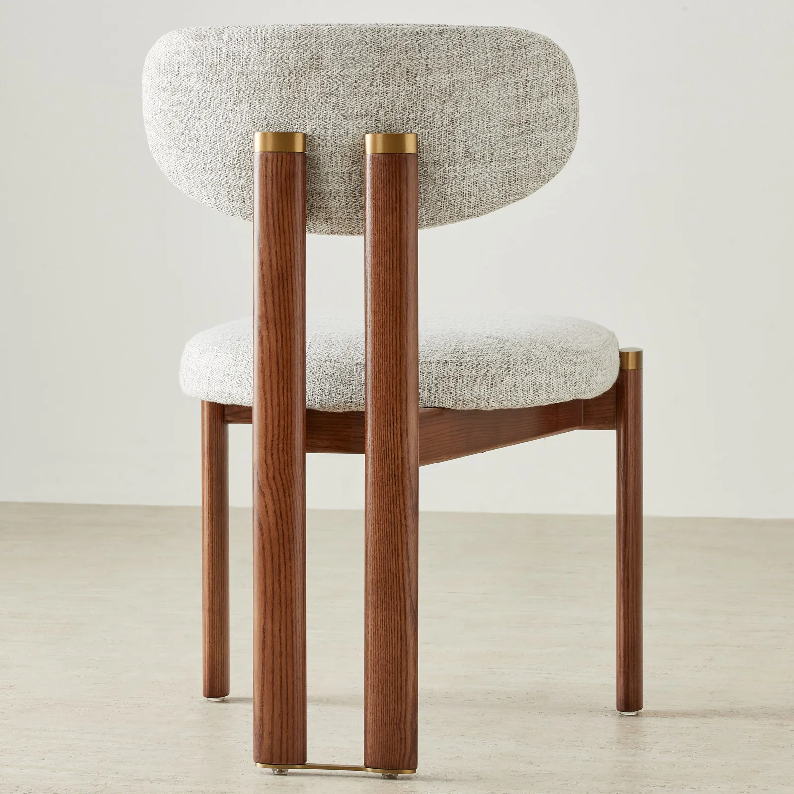 The toffee brown ash legs bring warmth and balance to the look, finished with understated brass caps. Built for both comfort and style, it fits seamlessly into modern dining spaces.