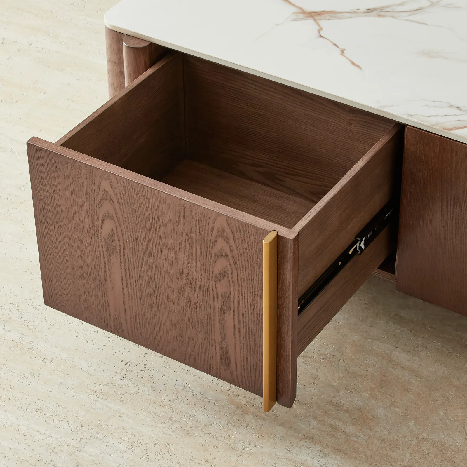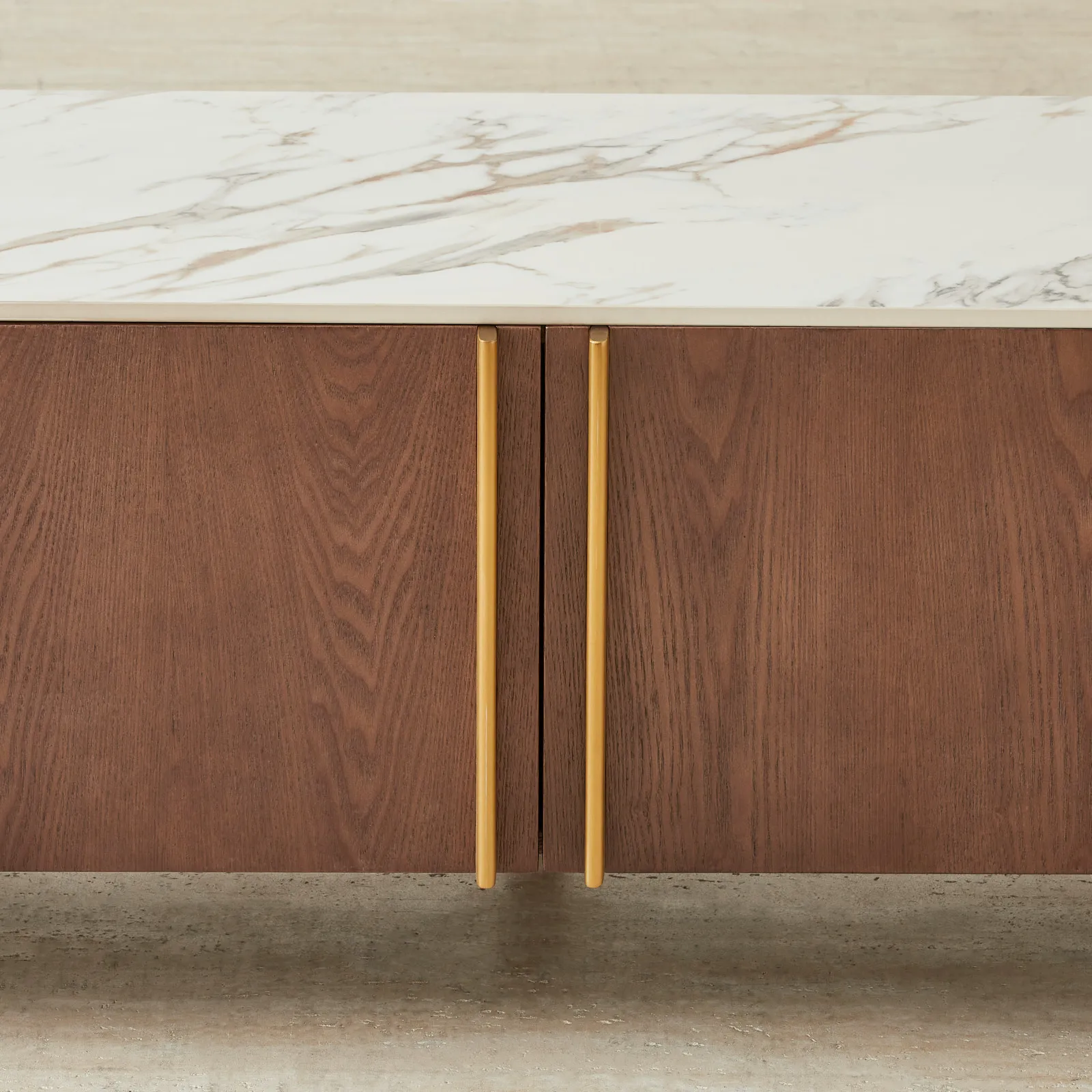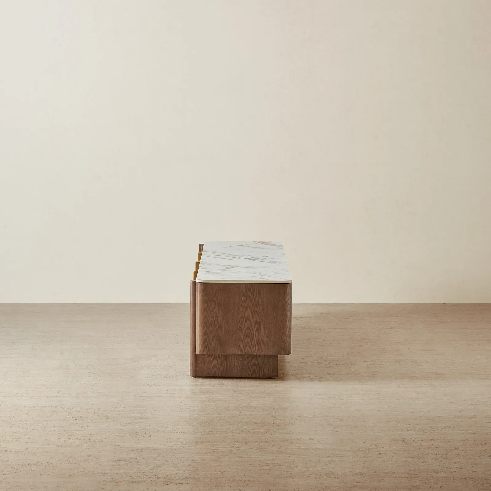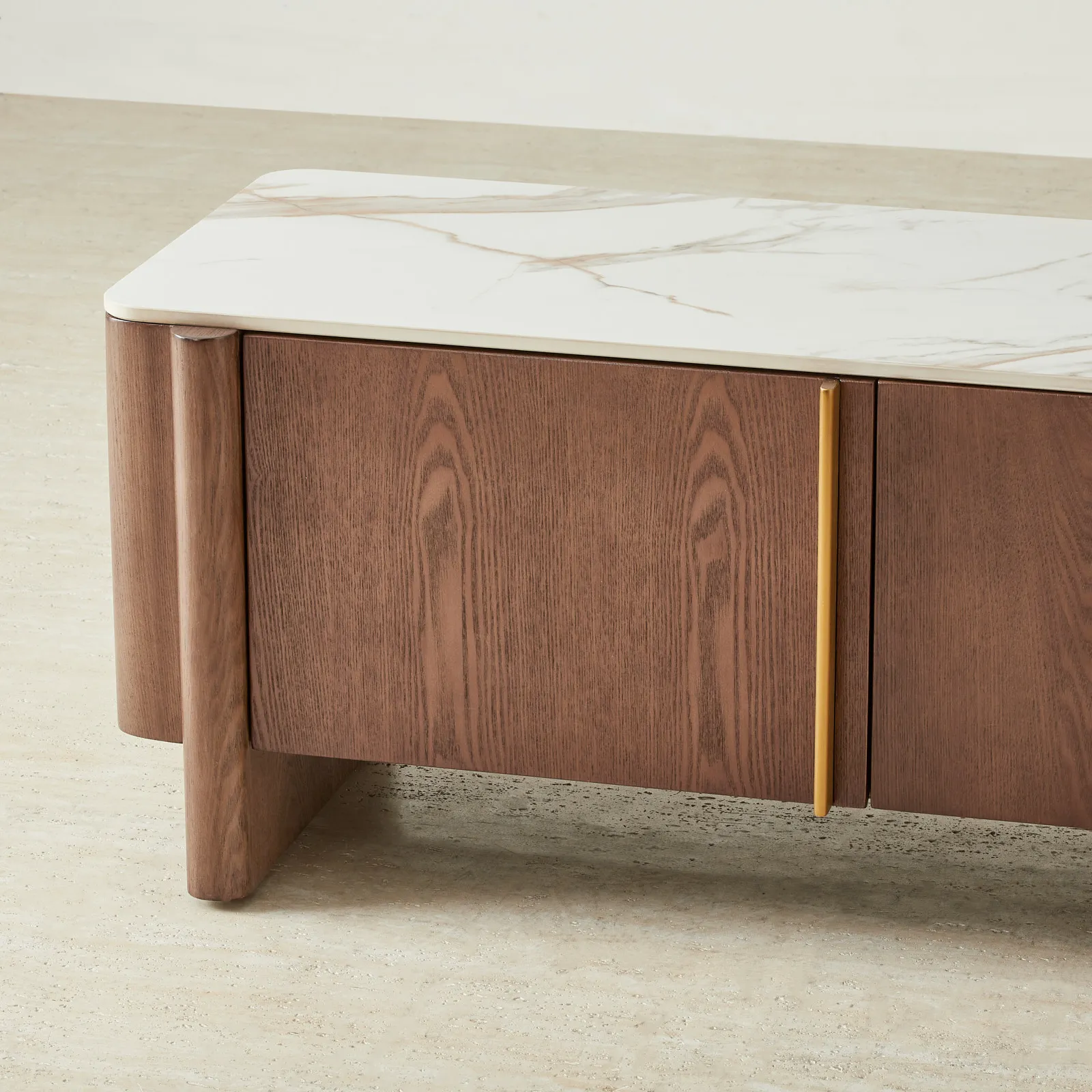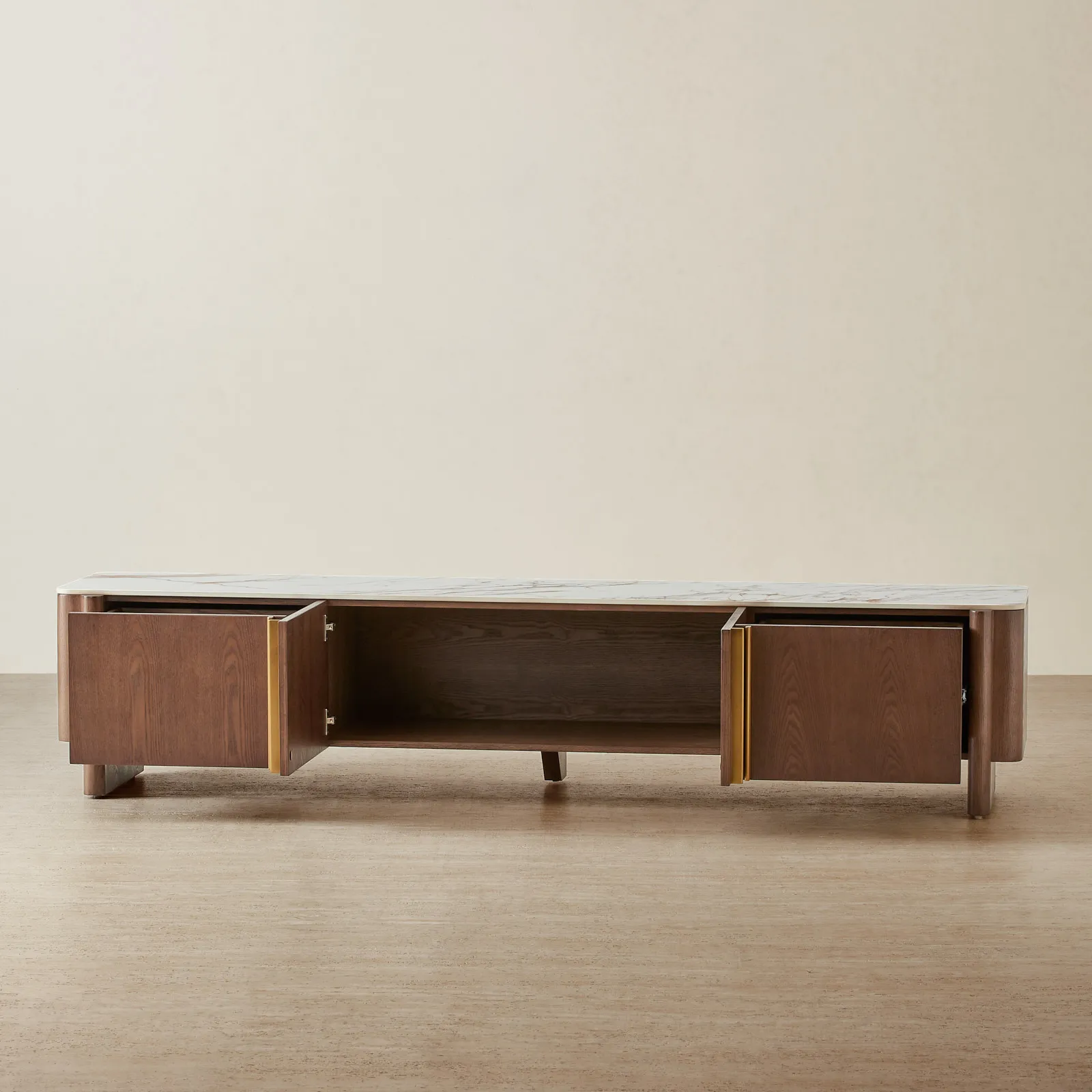Brass-toned accents flow between each panel, adding a subtle rhythm while concealing generous compartments designed for media storage and cable management.
