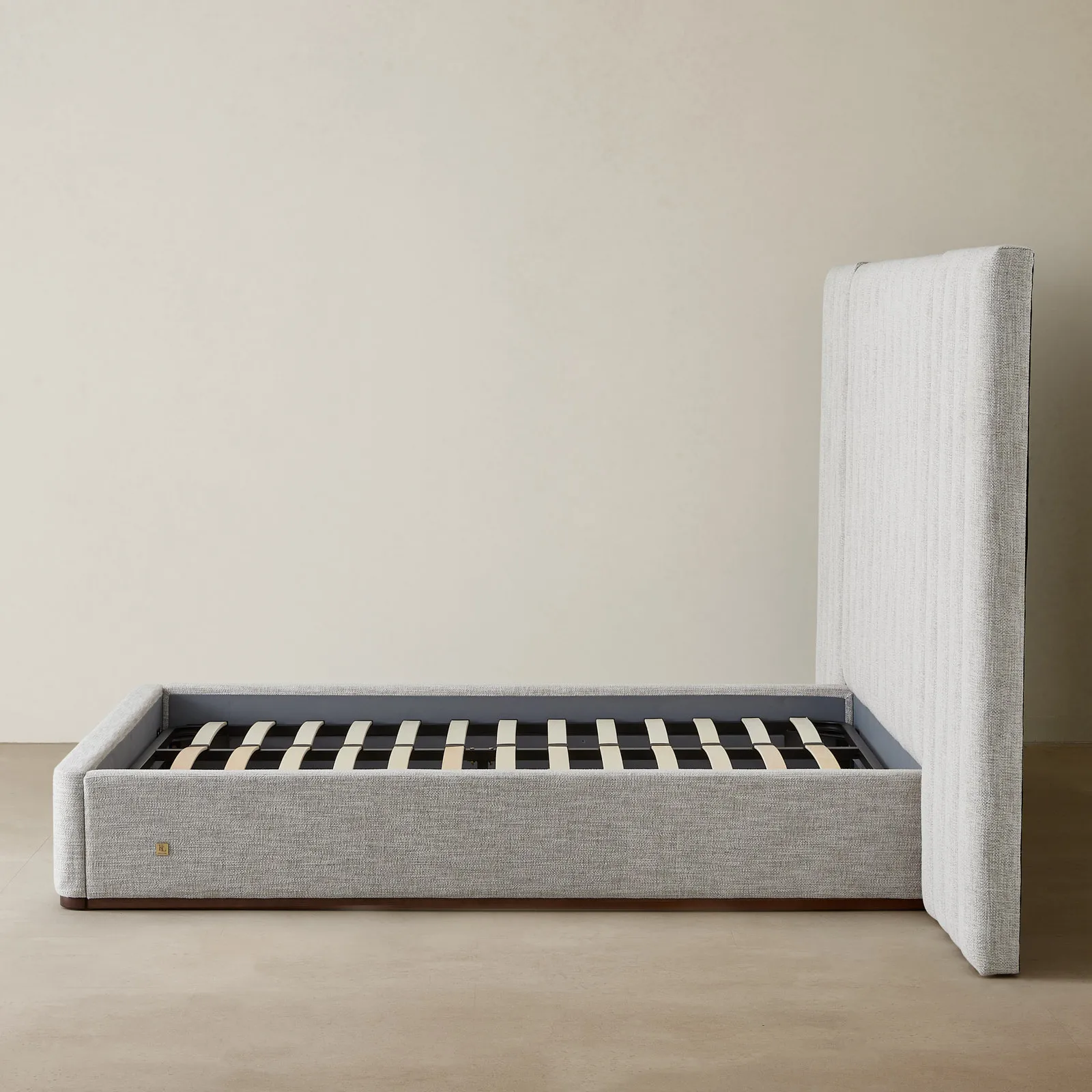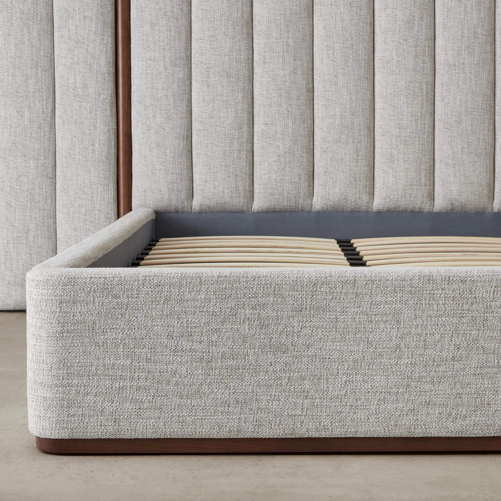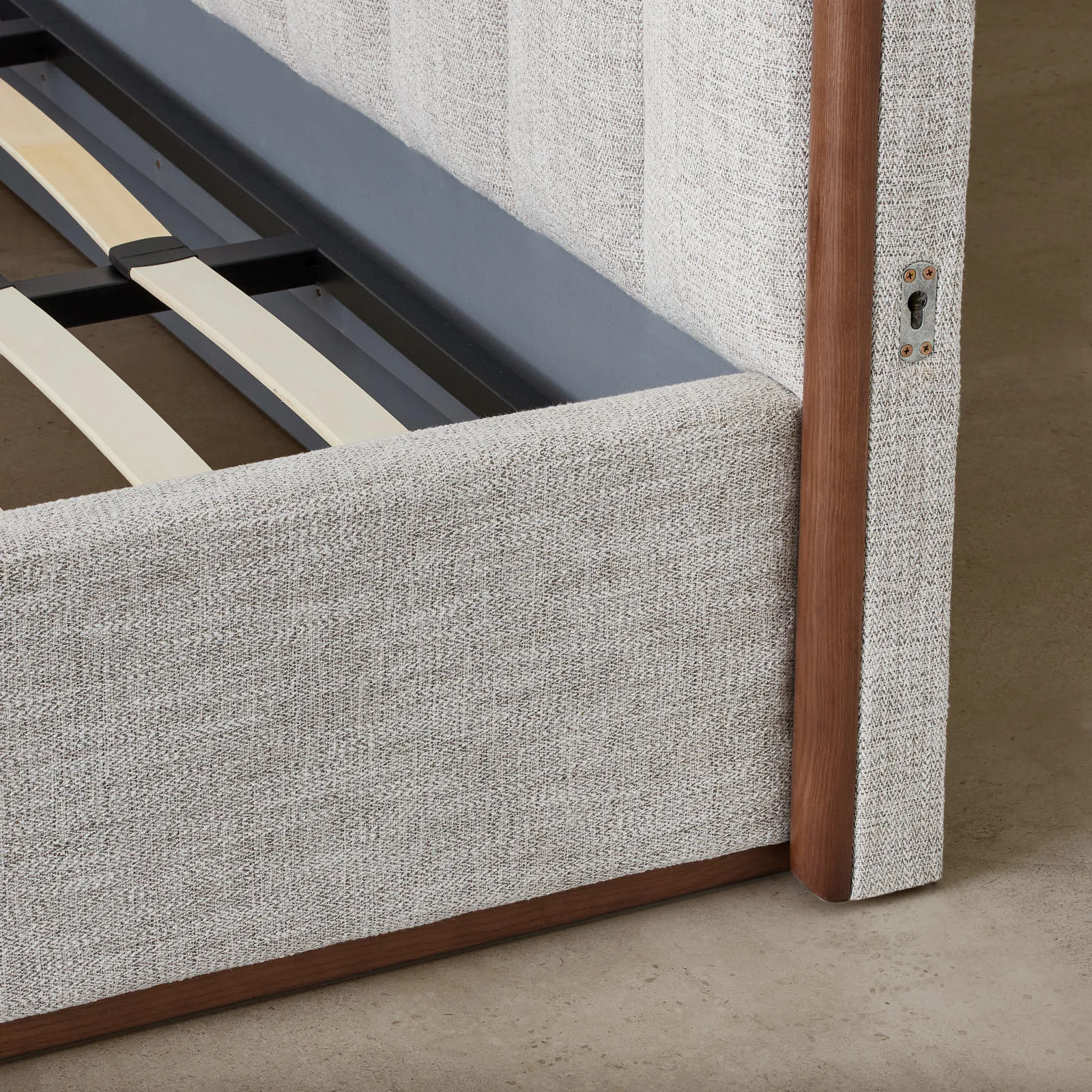 Draped in Murmur White woven fabric, it offers a soft, inviting texture. This combination gives the bed a modern aesthetic for contemporary bedrooms.