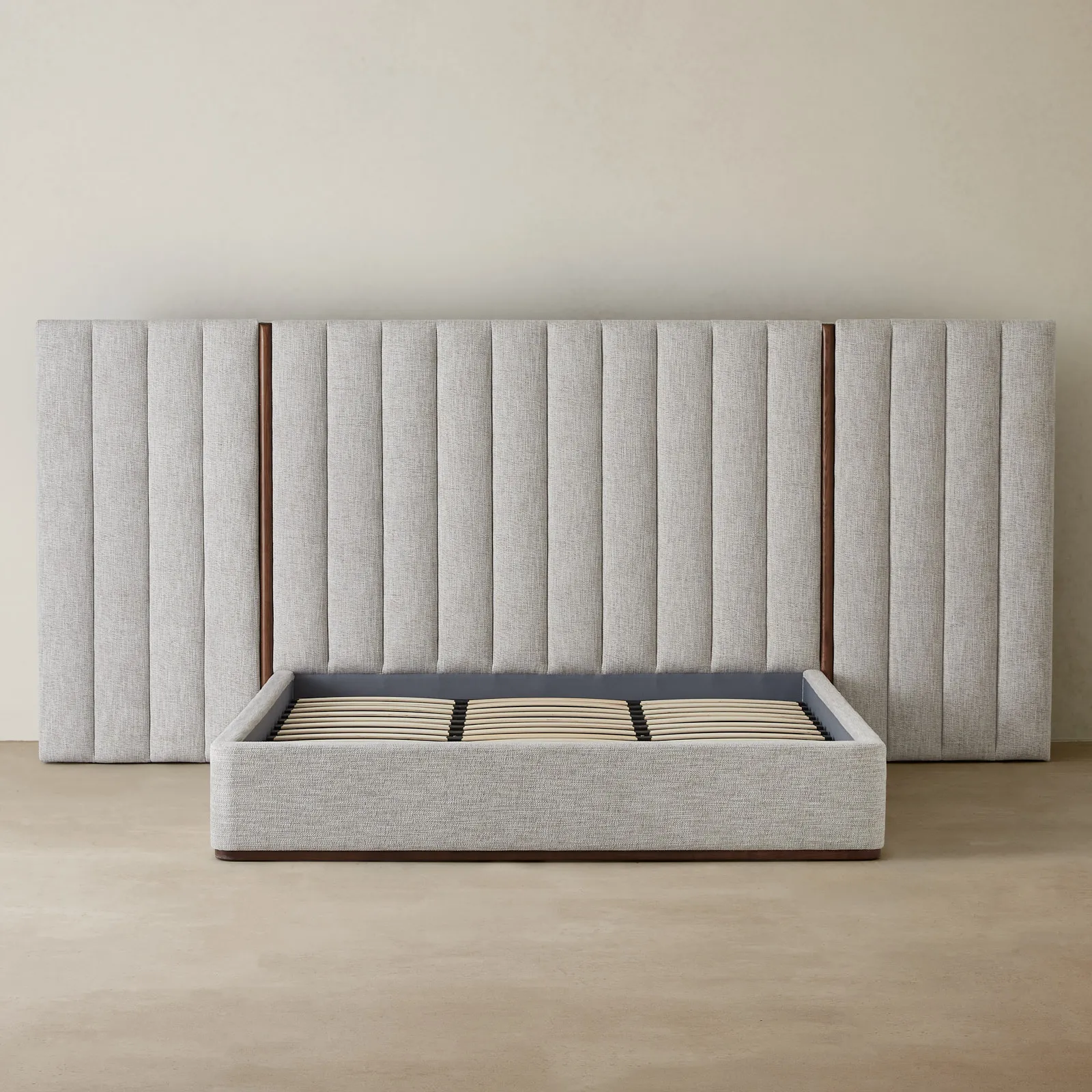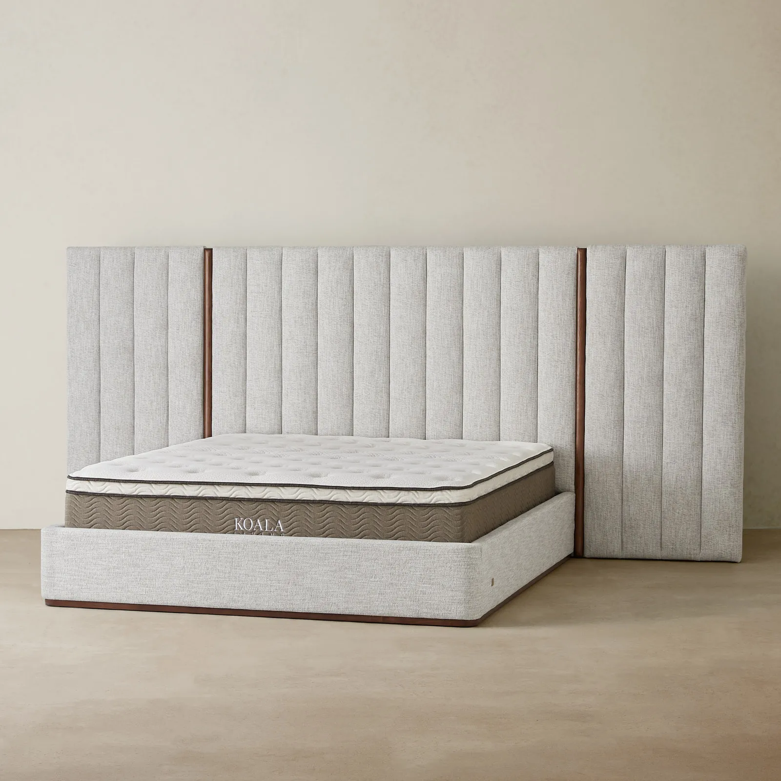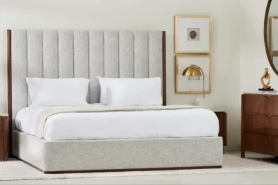 The Summerton Murmur White Fabric King Bed features a distinctive extended headboard with vertical tufting, providing a comfortable backrest.